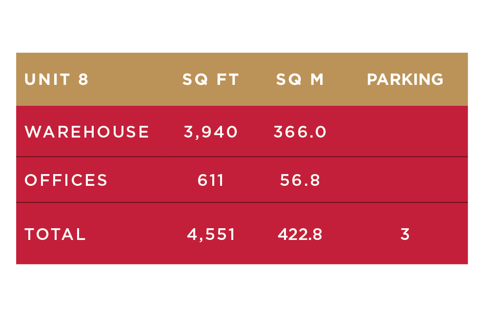 The unit benefits from a generous car parking ratio and dedicated service yard to the rear. The open plan offices are accessed via an entrance lobby and benefit from kitchenette and WC facilities. The warehouse areas have a clear internal height of approximately 6.5m, and is entirely column free with extensive natural light via the roof lights. Full height loading doors provide access to the dedicated service yard.