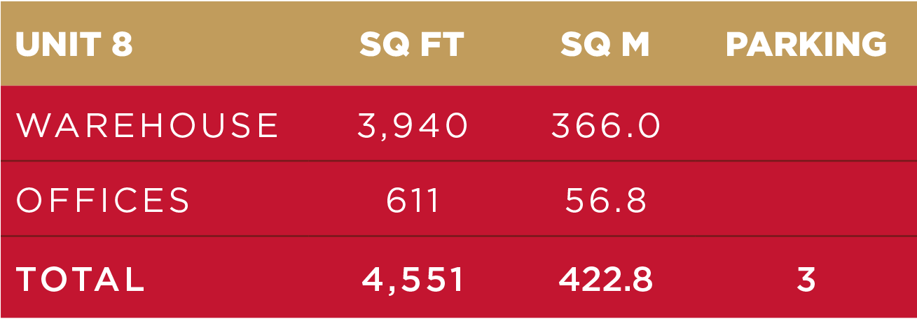 Internally, the warehouse is clear span and benefits from 5.8m clear internal height, rising to 8.2m at the ridge. There are ancillary offices at ground floor.